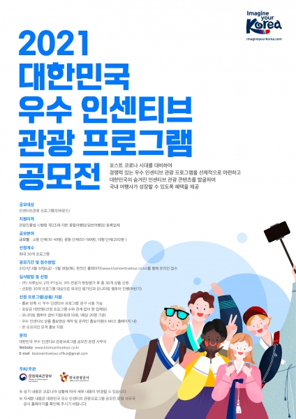 [충청뉴스큐] 문화체육관광부와 한국관광공사는 방한관광객 급감으로 사실상 영업 중단 상태인 여행업, 마이스 등 관련업계의 재생을 지원하기 위한 ‘대한민국 우수 인센티브관광 프로그램’ 및 ‘지역 매력발산 국제이벤트’ 공모를 실시한다.