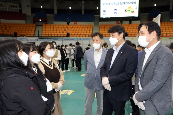[충청뉴스큐] 수원시의회 조석환 의장과 양진하 기획경제위원장은 28일 수원종합운동장 실내체육관에서 개최된 ‘2021 수원시 일자리박람회’ 현장을 찾았다.