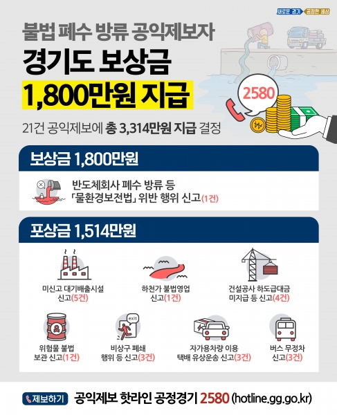 [충청뉴스큐] 경기도가 불법 폐수 방류를 제보한 공익제보자에게 보상금 1,800만원을 지급하기로 했다.