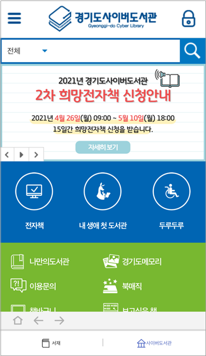 해당 전자책과 오디오북은 경기도사이버도서관 누리집 또는 앱을 이용하면 누구나 한 사람당 10권씩, 5일간 시간과 장소에 구애받지 않고 즐길 수 있다.