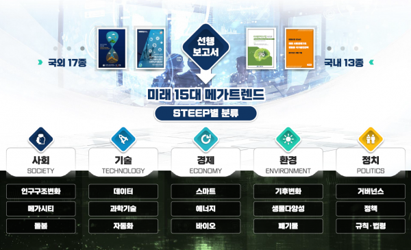 이날 보고회에서 울산연구원 이경우 혁신성장연구실장은 국내외 30종의 보고서를 분석해 도출해 미래사회 15대 메가트렌드를 사회, 기술, 경제, 환경, 정치 5개 분야로 분류했고 경제산업, 도시공간 및 교통, 도시환경 및 안전, 사회복지, 문화관광별 대응 이슈와 중장기 대응 전략도 발표한다.