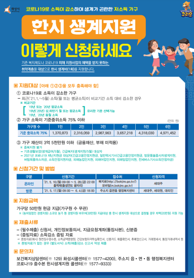 [충청뉴스큐] 화성시가 코로나19 장기화로 어려움을 겪고 있지만 각종 지원에서 소외된 저소득 가구를 위해 ‘한시 생계비 지원’사업을 마련했다.