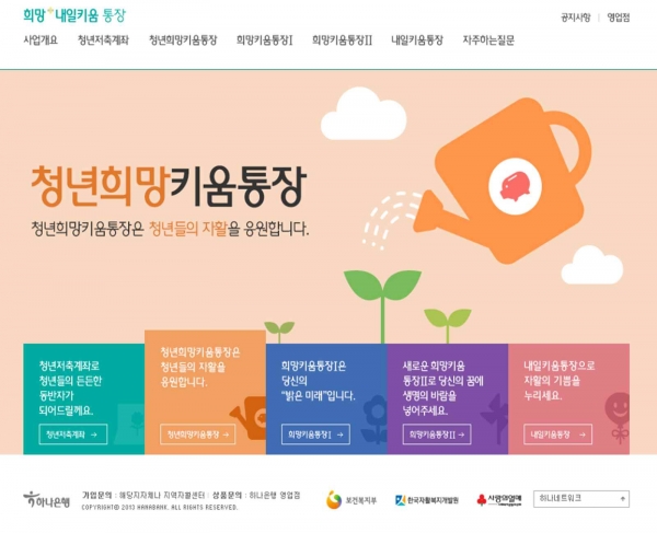 생계급여 수급가구의 일하는 청년이 대상인 청년희망키움통장은 3년 동안 근로·사업소득을 유지하면 본인 저축 없이도 매월 10만원의 근로소득공제금이 적립되고 청년 총소득의 45%가 근로소득장려금으로 추가 적립돼 만기 시점에 최대 2,368만원 정도를 받게 된다.