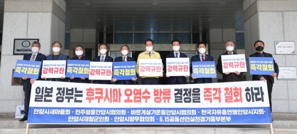 안양시는 4월 30일 시청사 현관에서 최대호 시장을 비롯해 관내 7개 민간단체 대표가 모여 후쿠시마 오염수 방류 규탄 및 철회를 촉구하는 결의대회를 가졌다고 밝혔다.