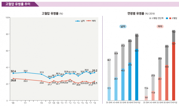 고혈압의 유병률은 나이가 들면서 현저히 높아지는데, 우리나라 60대 2명 중 1명 정도가 고혈압으로 보고되고 있다.