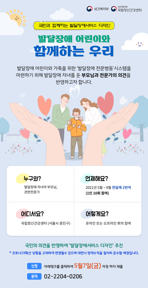 [충청뉴스큐] 국립정신건강센터는 발달장애 어린이와 가족이 상주하는 가족친화형‘발달장애 전문병동’신설 관련해, 5월 3일부터 오는 5월 7일까지 국민정책디자인단을 모집해 국민의 아이디어를 적극 반영하겠다고 밝혔다.