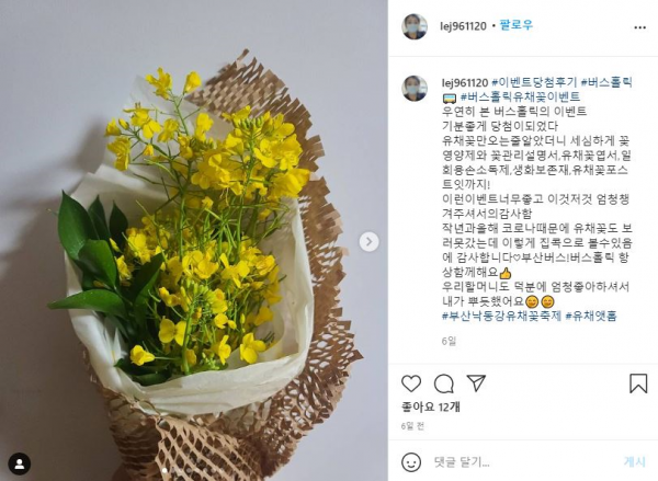 한 시민은 본인의 SNS 계정에 “집으로 생각지도 못한 낙동강 유채꽃이 배달왔다, 봄을 선물해준 부산시에게 감사하다”고 밝혔다.