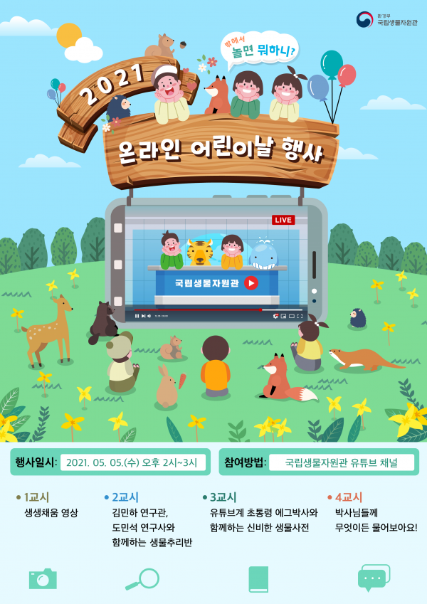 [충청뉴스큐] 환경부 소속 국립생물자원관은 어린이날을 맞아 오는 5일 오후 2시부터 1시간 동안 ’온라인 어린이날 행사‘를 개최한다.