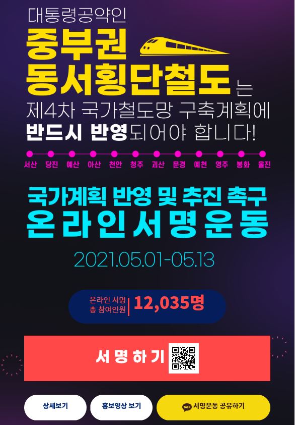 천안시는 중부권 동서횡단철도 건설 사업의 정부 계획 반영 및 추진 촉구를 위해 12개 시군과 온라인 서명운동에 돌입했다.