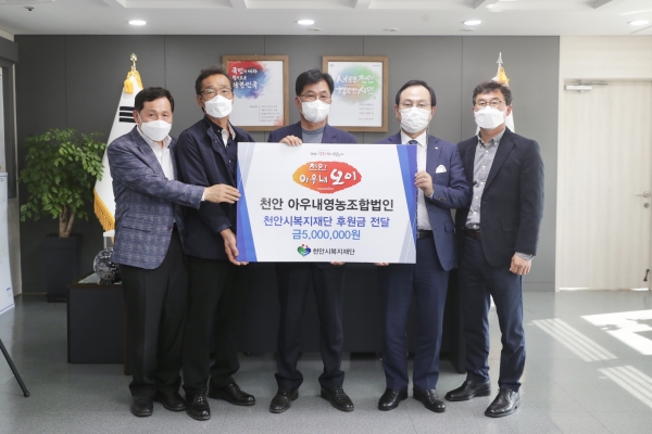 [충청뉴스큐] 아우내영농조합법인이 지난 3일 천안시청에서 지역 내 취약계층에 사용해달라며 천안시복지재단에 후원금 500만원을 전달했다.