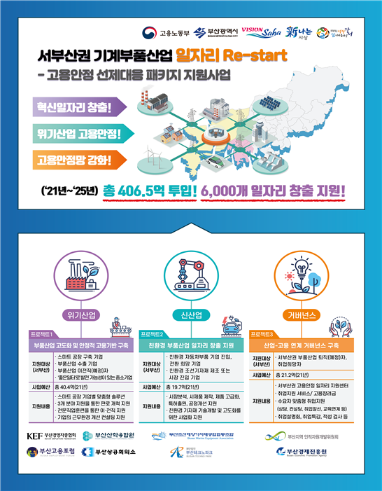 이에 부산시 컨소시엄은 패키지 지원사업을 통해 서부산권 부품산업을 대상으로 2021년~2025년까지 5년간 총 407억원을 투입, 6,000명의 고용창출을 목표로 사업을 추진하고 첫해인 2021년에는 81.3억을 투입해 3개 프로젝트, 9개의 세부사업을 추진해 1,110명의 고용을 창출한다는 목표이다.