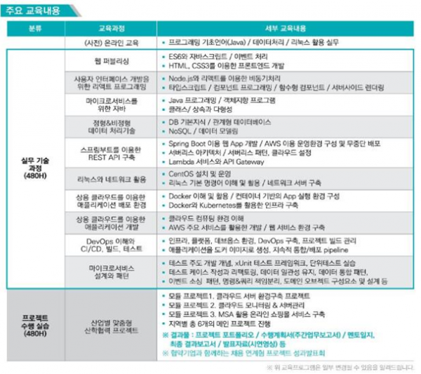 교육과정은 5월부터 11월까지 6개월 과정이며 졸업예정자·취업준비자 대상으로 960시간의 집중교육으로 구성되어 있다.