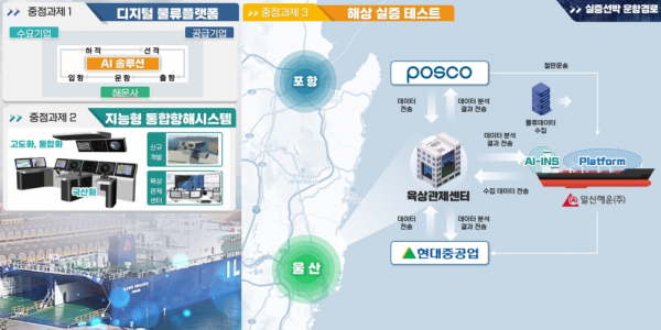 제품 상용화를 위한 실선기록 확보는 ‘해상 실증 테스트’로 물류·운항 정보의 디지털화와 지능형 통합항해시스템을 운항선박에 탑재해 화물 운송 중 해상 실증을 진행하는 사업이다.