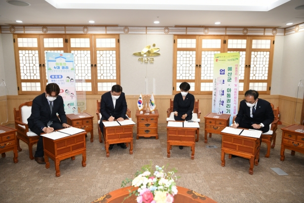 [충청뉴스큐] 예산군은 7일 아동 권리 보호 증진 및 아동친화도시 조성을 위해 국내 아동 권리기관인 굿네이버스, 세이브더칠드런, 초록우산 어린이재단과 업무협약을 체결했다.