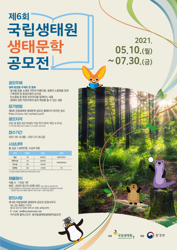 [충청뉴스큐] 환경부 산하 국립생태원은 생태와 환경에 대한 이해와 생태적 감수성 함양을 위해 ‘제6회 국립생태원 생태문학 공모전’을 개최하고 5월 10일부터 오는 7월 30일까지 작품을 접수한다.