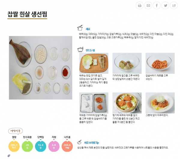 각 메뉴마다 조리 단계별 사진과 함께 열량·탄수화물·단백질·나트륨 등 영양성분 함량을 확인할 수 있어 건강한 식생활 관리에 도움이 될 것으로 기대한다.