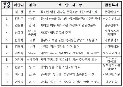 우수제안으로 청소년 활용 개방형 문화복합 공간 확대조성 일자리 창출을 위한 4차 산업혁명준비단 구성 지하철 이용 테마역을 조성하여 관광상품화 세대간 협업공동체 구성 노인을 위한 일자리 마련 등 11건으로 학생, 소상공인, 회사원, 시민단체, 통장, 자영업자 등 10대에서 60대까지 다양한 계층의 제안이 선정됐다.