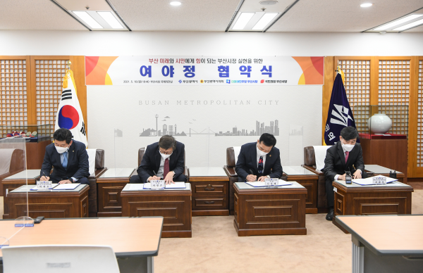 [충청뉴스큐] 부산시와 부산광역시의회, 더불어민주당 부산시당, 국민의힘 부산시당은 부산 미래와 시민에게 힘이 되는 부산시정 실현을 위한 여야정 협약식을 5월 10일 오전 10:40에 개최했다.
