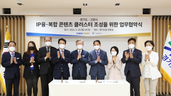 이재명 경기도지사와 이재준 고양시장은 10일 경기도청에서 안민석·이용우·홍정민 국회의원, 최만식·김경희 도의원 등이 참석한 가운데 ‘IP융·복합 콘텐츠 클러스터 조성’을 위한 업무협약서에 공동 서명했다.