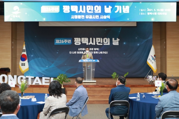 [충청뉴스큐] 평택시는 10일 제26주년 평택시민의 날을 맞아 평택시청 대회의실에서 시 승격 26주년을 기념하기 위한 ‘평택시민의 날 기념식’을 개최했다.