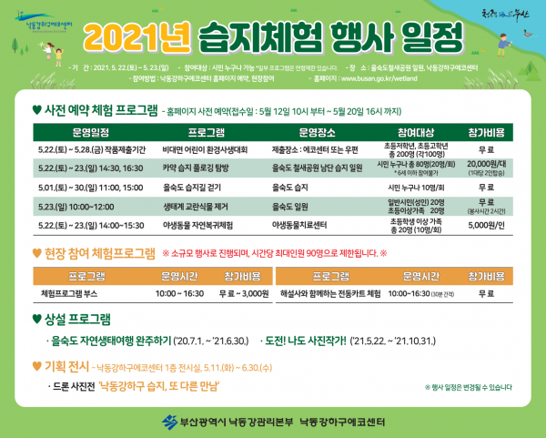 [충청뉴스큐] 부산시 낙동강하구에코센터는 5월 22일 23일 양일간 을숙도 철새공원 일원에서 코로나바이러스감염증-19 장기화로 지친 일상의 활력소가 될 ‘2021년 습지체험 행사’를 개최한다고 밝혔다.