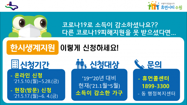 ‘한시생계지원사업’은 정부 4차 재난지원금 정책의 하나로 지원 대상은 코로나19 사태 이후 소득이 감소한 가구다.