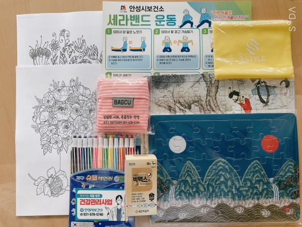 건강지킴이 꾸러미는 우울예방 및 신체활동을 위한 세라밴드와 운동 포스터, 인지 학습지 및 퍼즐, 영양제 등으로 구성했으며 희망엽서도 제공한다.