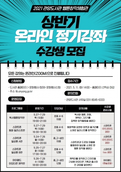 [충청뉴스큐] 안양시립관양도서관이 5년 연속 ‘웹툰창작체험관 조성 및 운영사업’ 기관으로 선정돼 5월 24일부터 웹툰창작체험관 상반기 온라인 정기 강좌 프로그램을 운영한다.