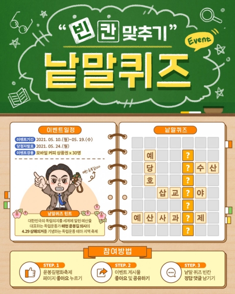 또한 온라인 이벤트로는 평화축제 현장을 방문한 인증샷을 올리는 ‘내가 찍은 윤봉길 의사를 보여줘’가 오는 5월 30일까지, 빈칸 맞추기 낱말퀴즈는 오는 19일까지 각각 진행되고 있으며 당첨자에게는 문화상품권과 모바일 커피 상품권 등이 지급된다.