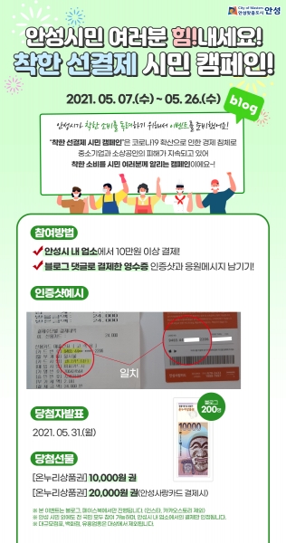 시는 관내 업체에서 소비자가 10만원 이상 선 결제를 하고 안성시 공식 페이스북 및 블로그 내 캠페인 게시글에 댓글로 인증하면, 추첨을 통해 페이스북에서 300명, 블로그에서 200명을 선정해 온누리상품권 1만원을 경품으로 지급할 예정이며 당첨자는 5월 31일 해당 SNS를 통해 발표한다.