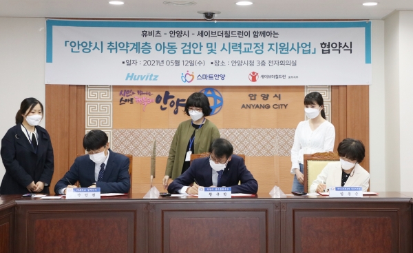 이날 협약식에는 안양시 관계공무원을 비롯해 ㈜휴비츠에서는 박인권 상무이사, 세이브더칠드런 임용순 중부지부장 등 기관관계인 9명이 함께했고 각 한 명이 기관을 대표해 협약서에 서명했다.
