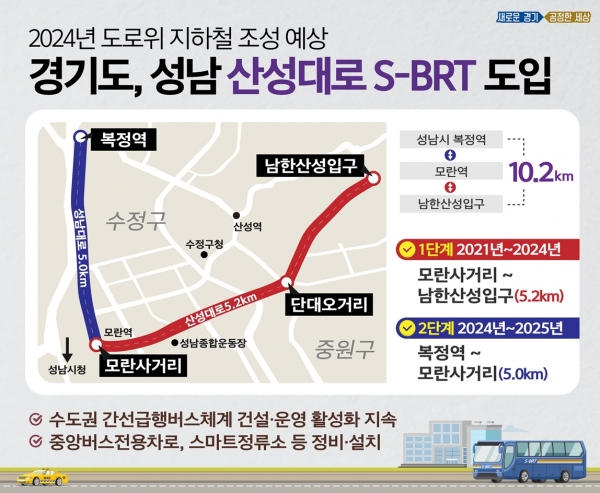 경기도는 올해부터 국토교통부 대도시권광역교통위원회, 성남시와의 협업을 통해 ‘성남 S-BRT 사업’을 본격 추진해 나갈 계획이라고 13일 밝혔다.