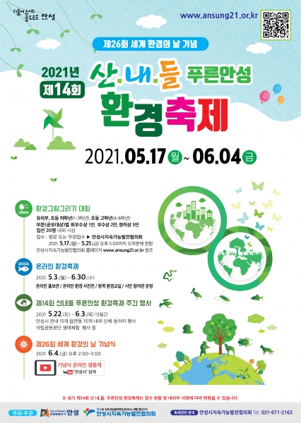 [충청뉴스큐] 안성시는 2021년 제26회 세계환경의 날을 맞아 오는 17일부터 6월 4일까지 안성시 주최, 지속가능발전협의회 주관으로 ‘제14회 산내들 푸른안성 환경축제’를 개최한다고 밝혔다.