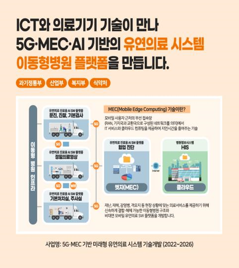 o 사업의 성공적인 추진을 위해 과기정통부·산업부 ·복지부 간 긴밀한 협업을 추진해 소프트웨어와 하드웨어 기술개발부터 실증·인허가까지 5세대·인공지능 디지털기반 이동형 의료시스템 기술개발을 선도하고 해외수출로 연계해 나갈 예정이다.