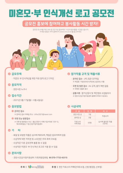 천안 시민이라면 누구나 참여할 수 있으며 응모작은 미혼모·부에 대한 인식개선 로고를 자유롭게 창작해 제출하면 된다.