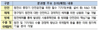 최근 원전산업은 후쿠시마 원전사고, 경주·포항지진 등으로 인한 원전안전 중요성 증가, 원전산업생태계 경쟁력 유지 필요, 원전해체· 방사능 폐기물 등 환경 분야에 대한 수요 증가 등의 변화가 발생하고 있으며, 이러한 변화에 따라 "Nu-Tech 2030"은 안전, 해체, 방폐, 수출 및 국제협력 등 4개의 분야로 나누어 논의 할 예정이다.