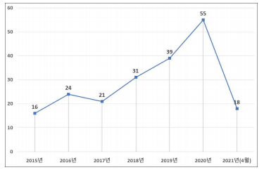 특허청에 따르면, SNS 활용 마케팅 관련 특허출원은 2015년에서 2017년까지 매년 20건 내·외의 출원을 유지하다가 2018년 31건, 2019년 39건, 2020년 55건, 2021년 18건으로 최근 5년간 연평균 28% 증가했다고 밝혔다.