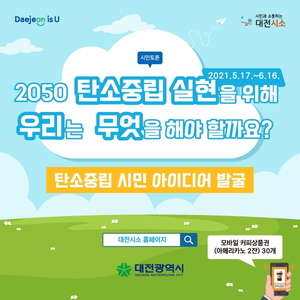 [충청뉴스큐] 대전시는 정책제안 플랫폼 ‘대전시소’에서 ‘2050 탄소중립 실현을 위해 우리는 무엇을 해야할까요?’라는 주제로 5월 17일부터 한달 간 시민들의 다양한 의견을 수렴한다.
