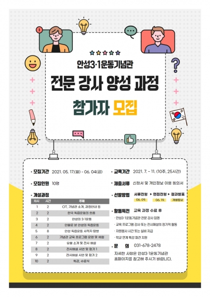 교육은 안성3.1운동 및 독립운동사에 관심이 많고 전문 강사 활동을 원하는 일반시민 및 대학생이면 누구나 신청할 수 있으며 서류 심사 및 면접을 통해 최종 교육 대상자 10명을 선발해 전문 강사 양성 과정이 운영될 예정이다.