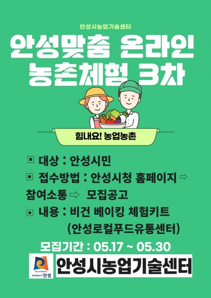 [충청뉴스큐] 안성시농업기술센터에서는 5월 17일부터 5월 31일까지 안성시 홈페이지를 통해 안성맞춤 온라인 농촌체험 3차 교육생을 모집한다.