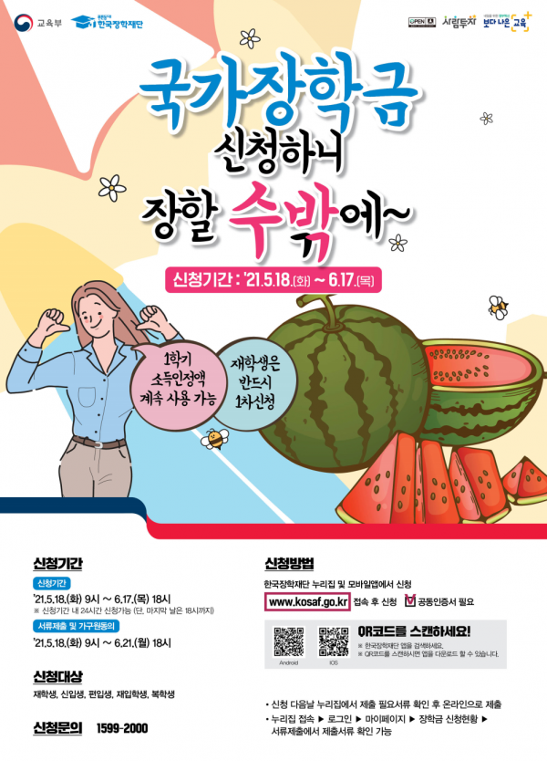 [충청뉴스큐] 교육부와 한국장학재단은 오는 5월 18일 9시부터 6월 17일까지 2021학년도 2학기 1차 국가장학금 신청을 받는다.