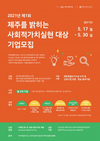 [충청뉴스큐] 제주특별자치도는 제주특별자치도사회적경제지원센터와 공동으로 ‘제1회 제주를 밝히는 사회적 가치 실현 대상’기업을 공모하기로 하고 17일부터 모집한다고 밝혔다.