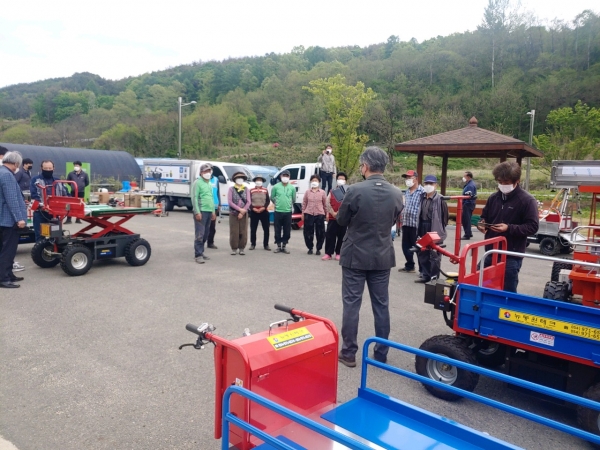 이날 컨설팅 전문가가 포도재배 작업의 특성과 농업인의 연령, 건강 상태 등을 고려해 선정한 안전성 향상 효과가 큰 운반차 2종과 방독면, 안전화 등의 안전 보호구 10종 총 180여점이 보급됐다.