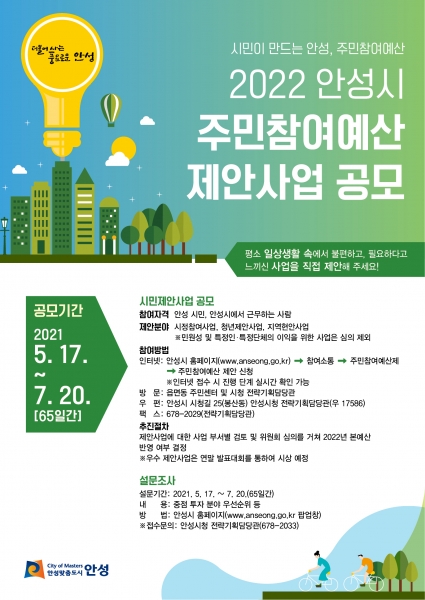 [충청뉴스큐] 안성시는 오는 7월 20일까지 2022년도 예산 편성을 위한 주민참여예산 제안사업 공모 및 설문조사를 실시한다고 밝혔다.