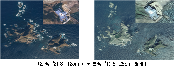 지난 3월에 촬영된 독도의 12cm 해상도 항공사진은 기존 25cm 해상도의 항공사진에서는 확인이 어려운 독도 서도 나루터의 태극기까지 선명하게 확인할 수 있다.