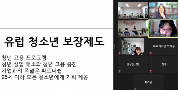 특히 화상회의에 참여한 위원들은 “유럽연합의 청소년정책 중 ‘청소년보장제도’와 ‘청소년 주간 정책’은 입시위주의 우리 청소년들에게는 낯설지만 매우 관심이 가는 제도”고 입을 모았다.