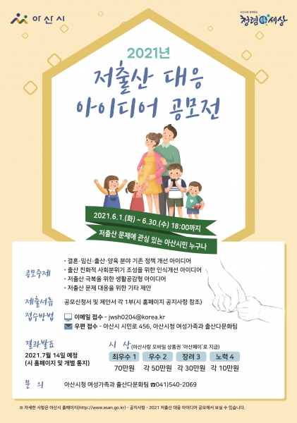 공모전은 6월 1일부터 30일까지 한 달간 진행되고 저출산 문제에 관심이 있는 아산시민이면 누구나 참여 가능하며 자세한 사항은 아산시 홈페이지 고시·공고에서 확인하면 된다.