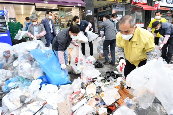[충청뉴스큐] 조무영 수원시 제2부시장과 수원시 협업 기관 기관장들이 24일 오전, 팔달구 매산동 상가 지역에서 반입 기준에 미치지 못해 수거되지 않은 쓰레기를 올바르게 분리하는 작업을 했다.