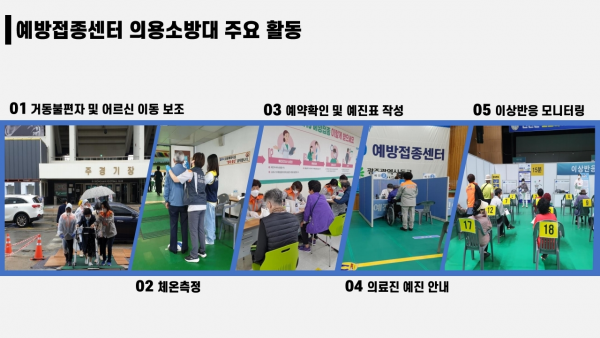 주요활동 내용은 거동불편자 및 어르신 이동 보조, 이동 동선 안내, 체온 측정, 예약 여부 확인, 예진표 작성 등으이며 접종 후 이상반응 모니터링 장소에서 119구급대원의 보조 역할을 수행하기도 한다.