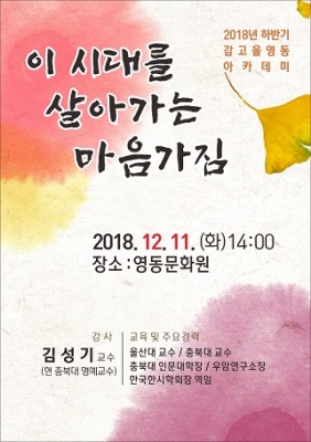 [충청뉴스큐] 충북 영동군은 오는 11일 오후 2시 영동문화원에서 김성기 강사를 초청해 ‘이 시대를 살아가는 마음가짐’이라는 주제로 2018 하반기 감고을영동아카데미를 개최한다고 지난 4일 밝혔다.